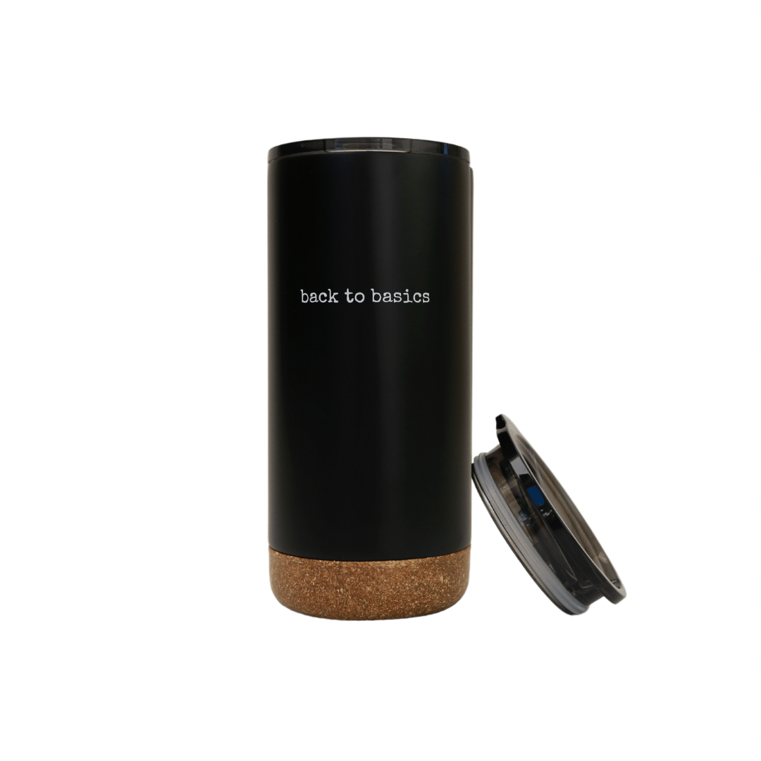 Choose the eco-friendly way to stay fueled throughout the day with our Back to Basics Insulated Tumbler. The sleek black matte finish and real cork bottom will have you sipping in style throughout the day.
